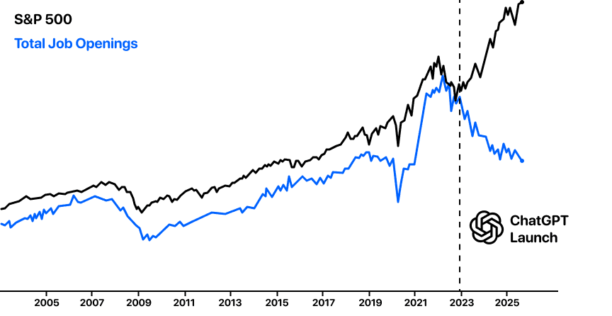 It’s a long-term view of job openings (blue) vs the S&P 500 (black). The dotted line shows when ChatGPT launched in November of 2022.