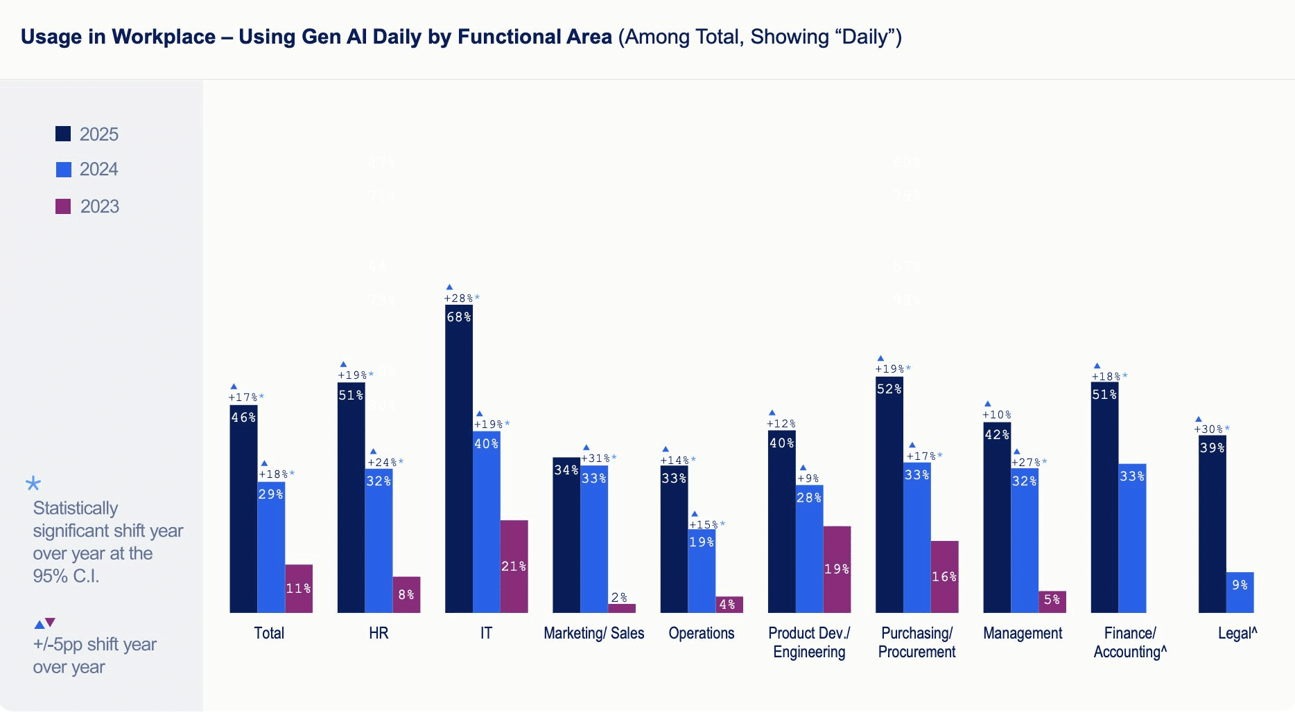 As you can see, fully 68% of IT workers are using AI on a daily basis, up from 21% in 2023. And 39% of legal workers are now using AI every day, up from just 9% last year.